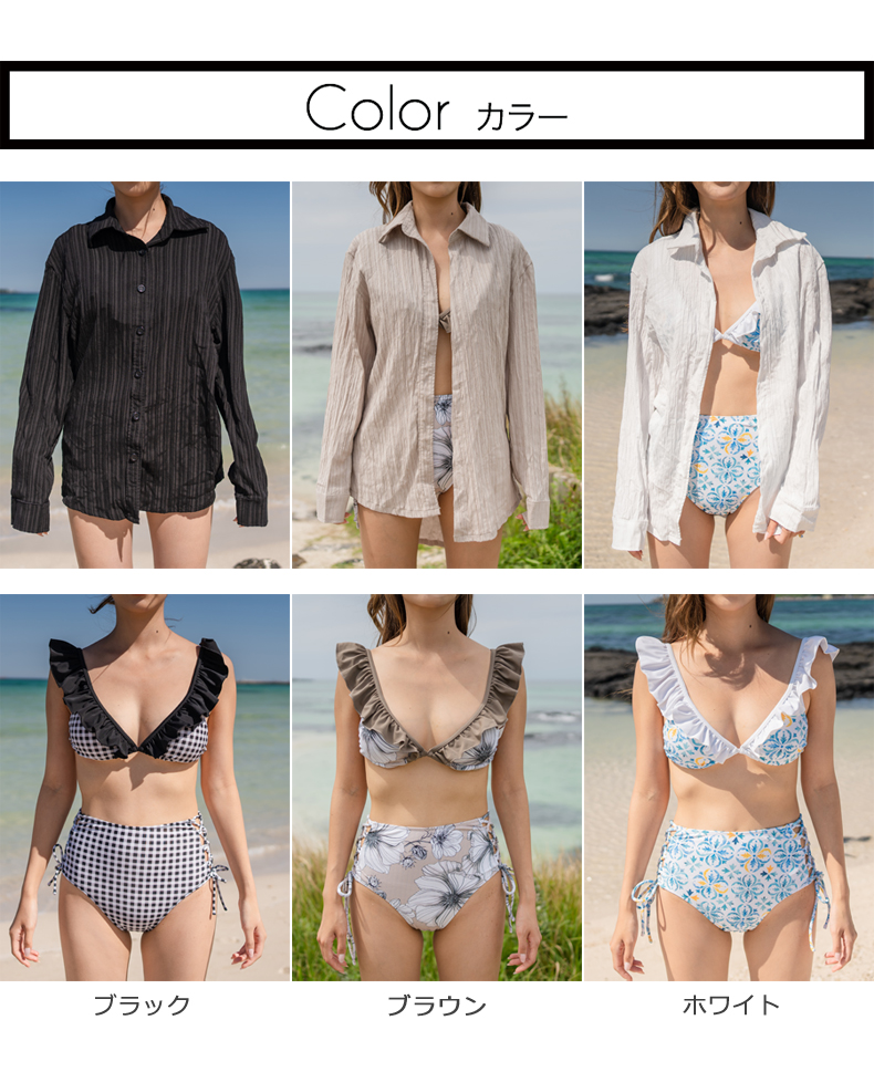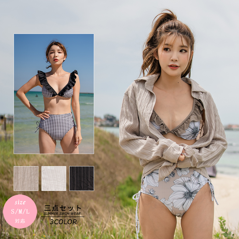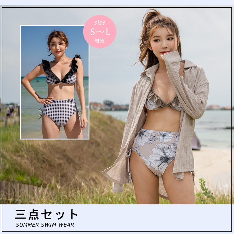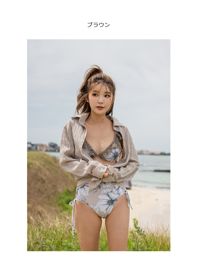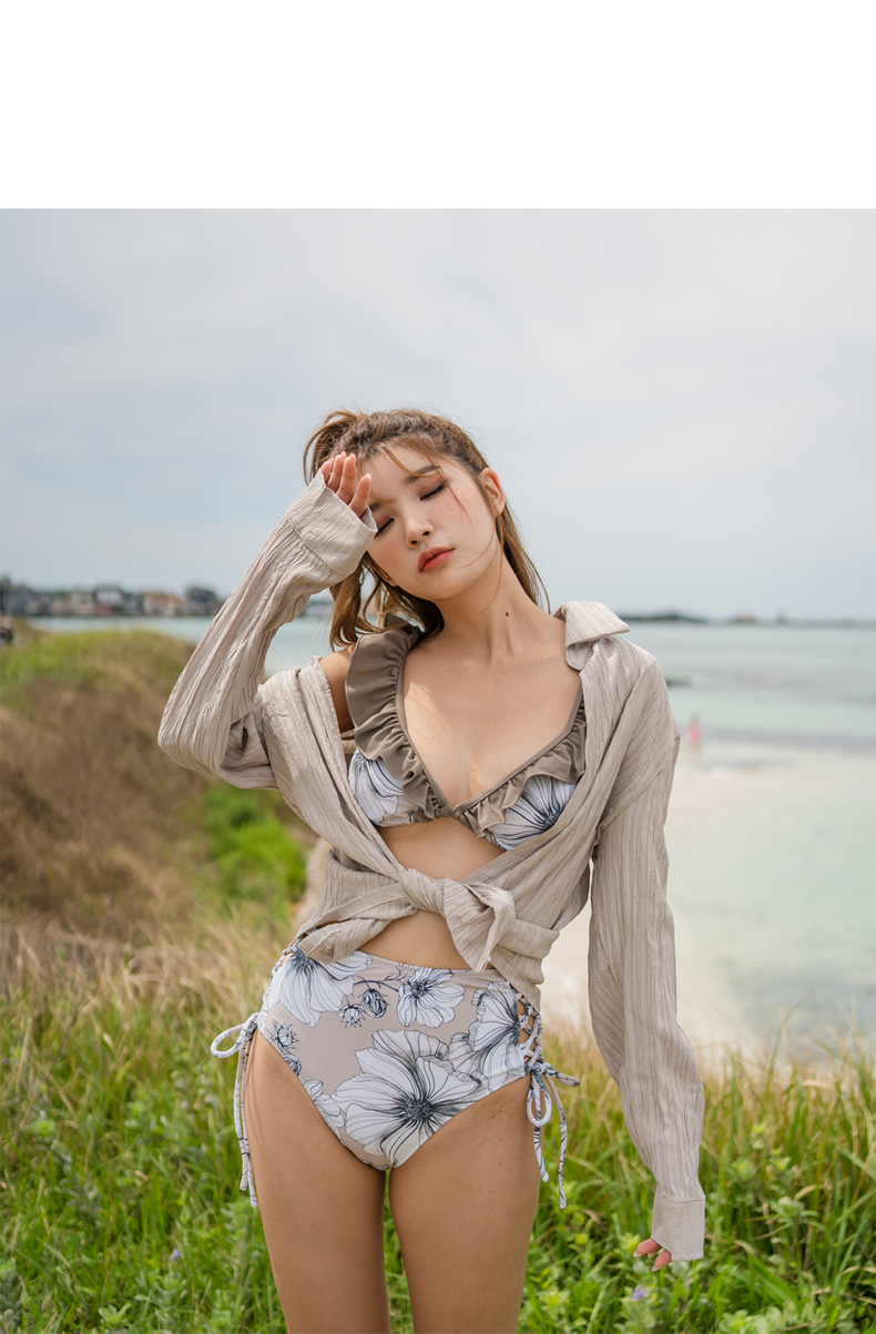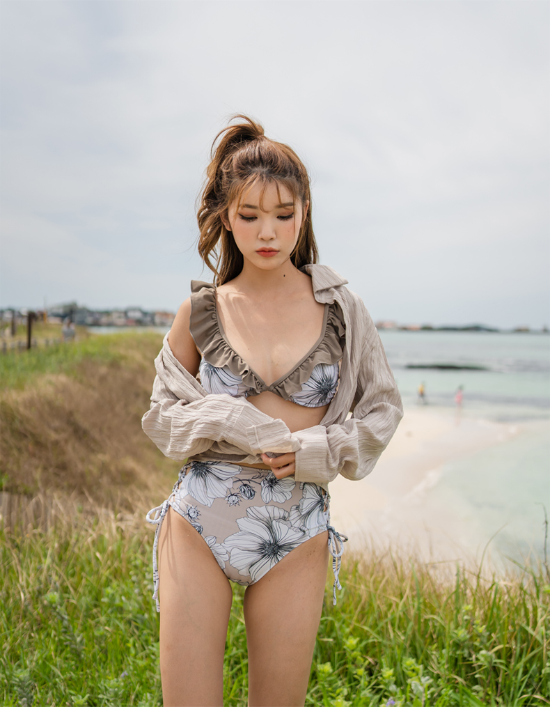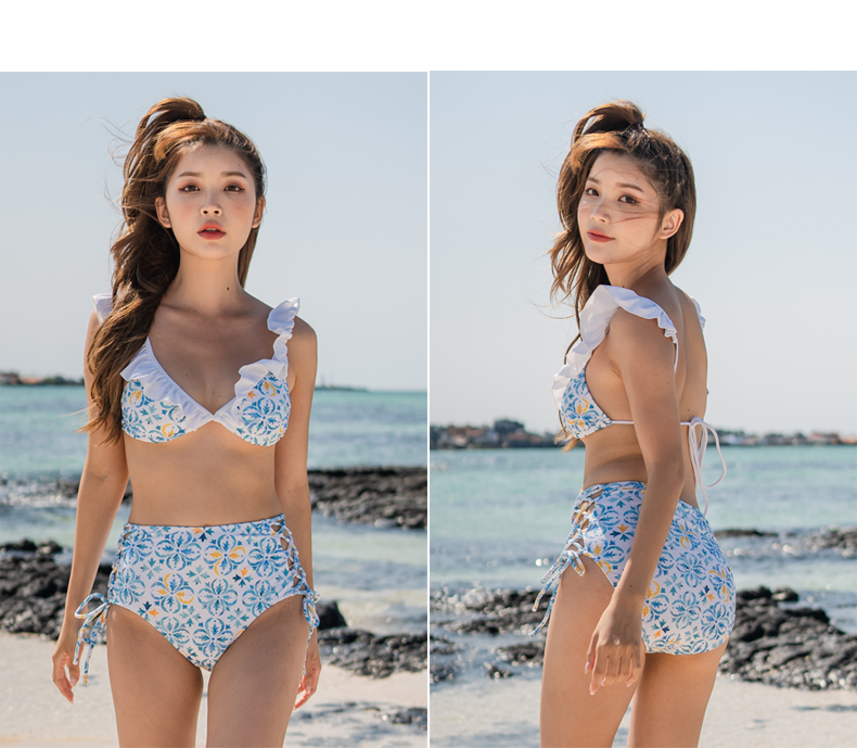 Yシャツ付きフリルブルーとハイウェストパンツの水着3点セット [SYZ2031]