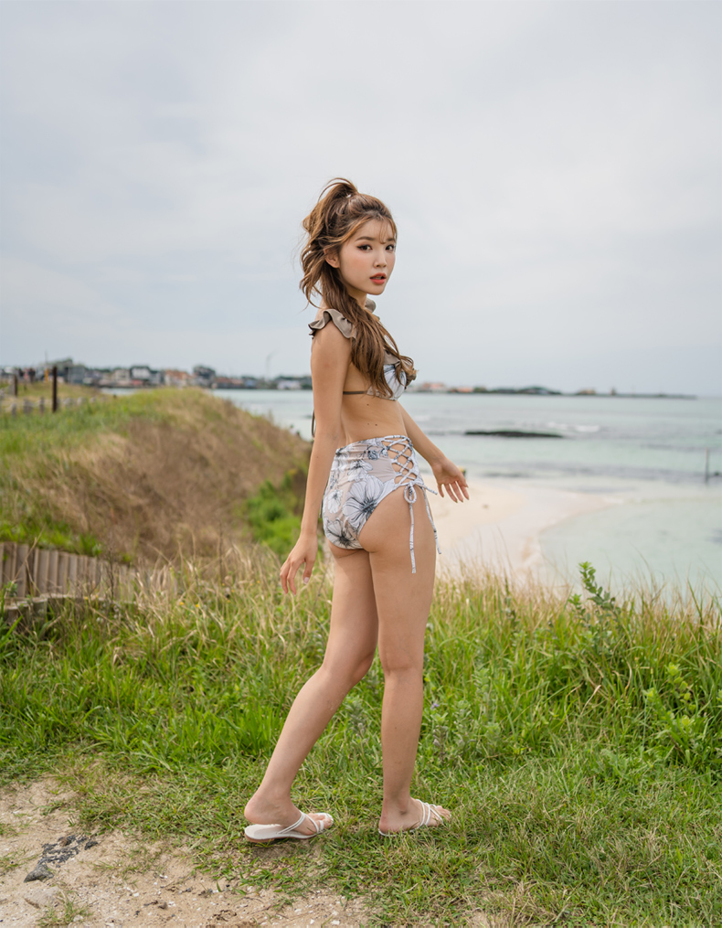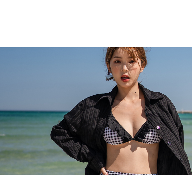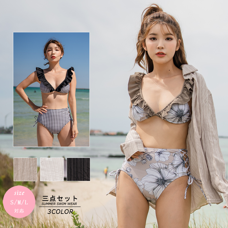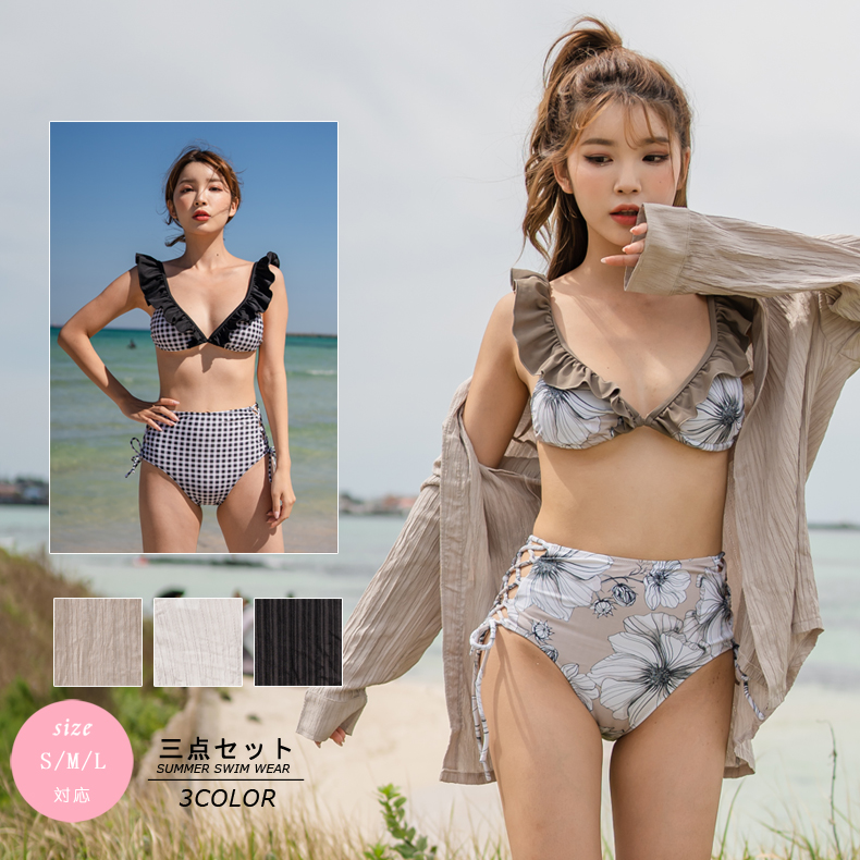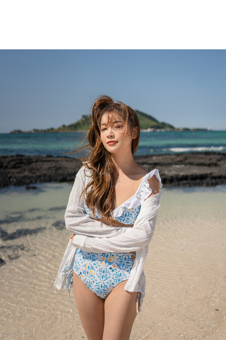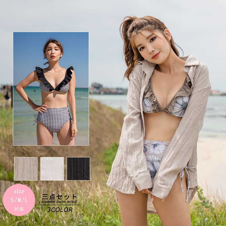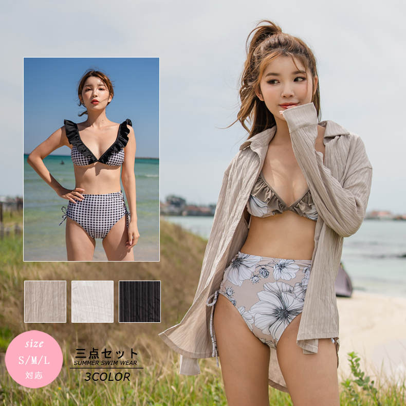 Yシャツ付きフリルブルーとハイウェストパンツの水着3点セット [SYZ2031]