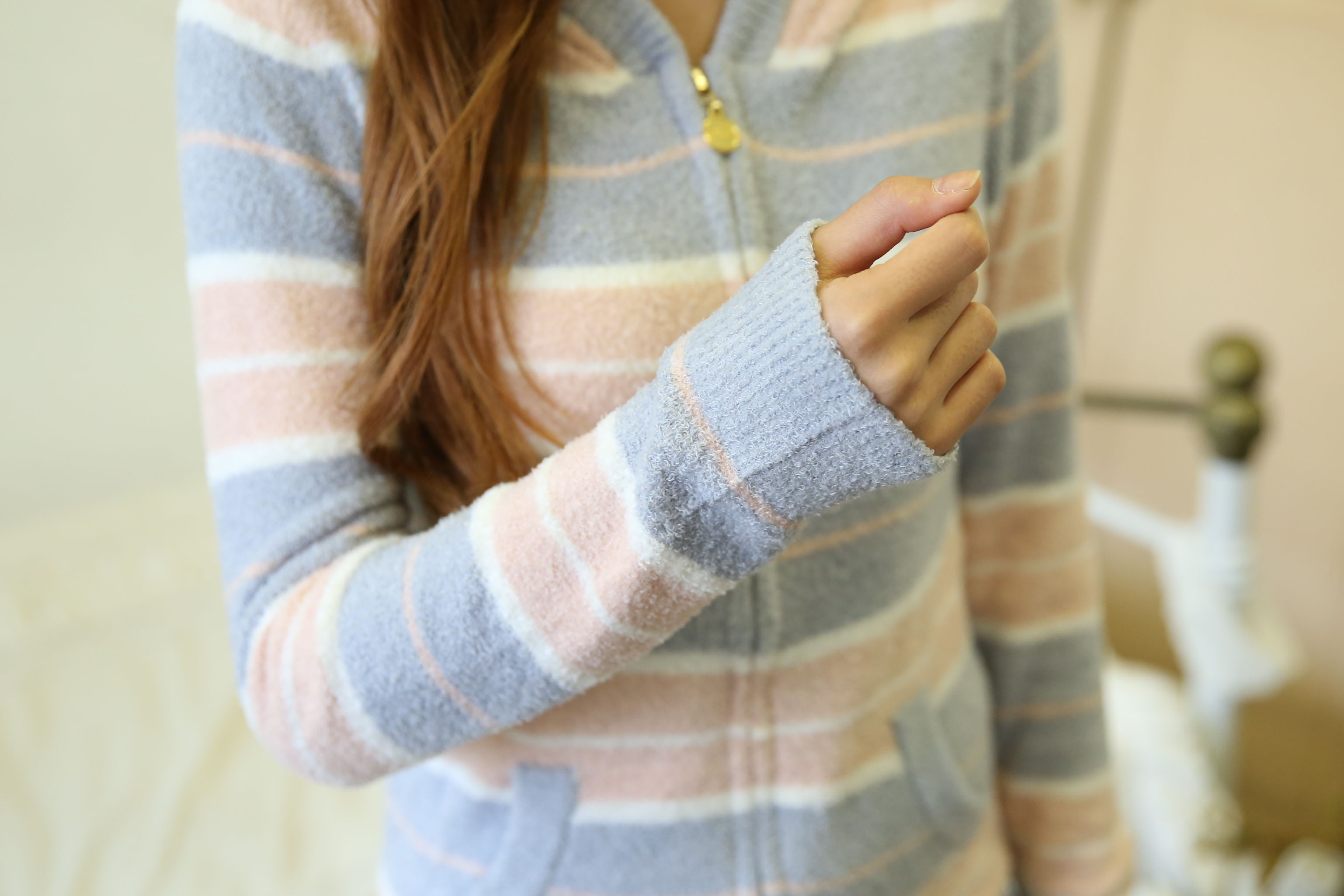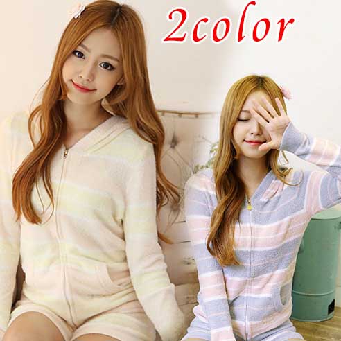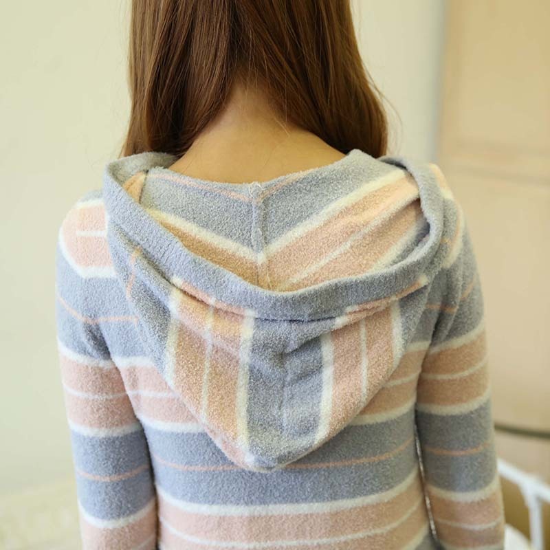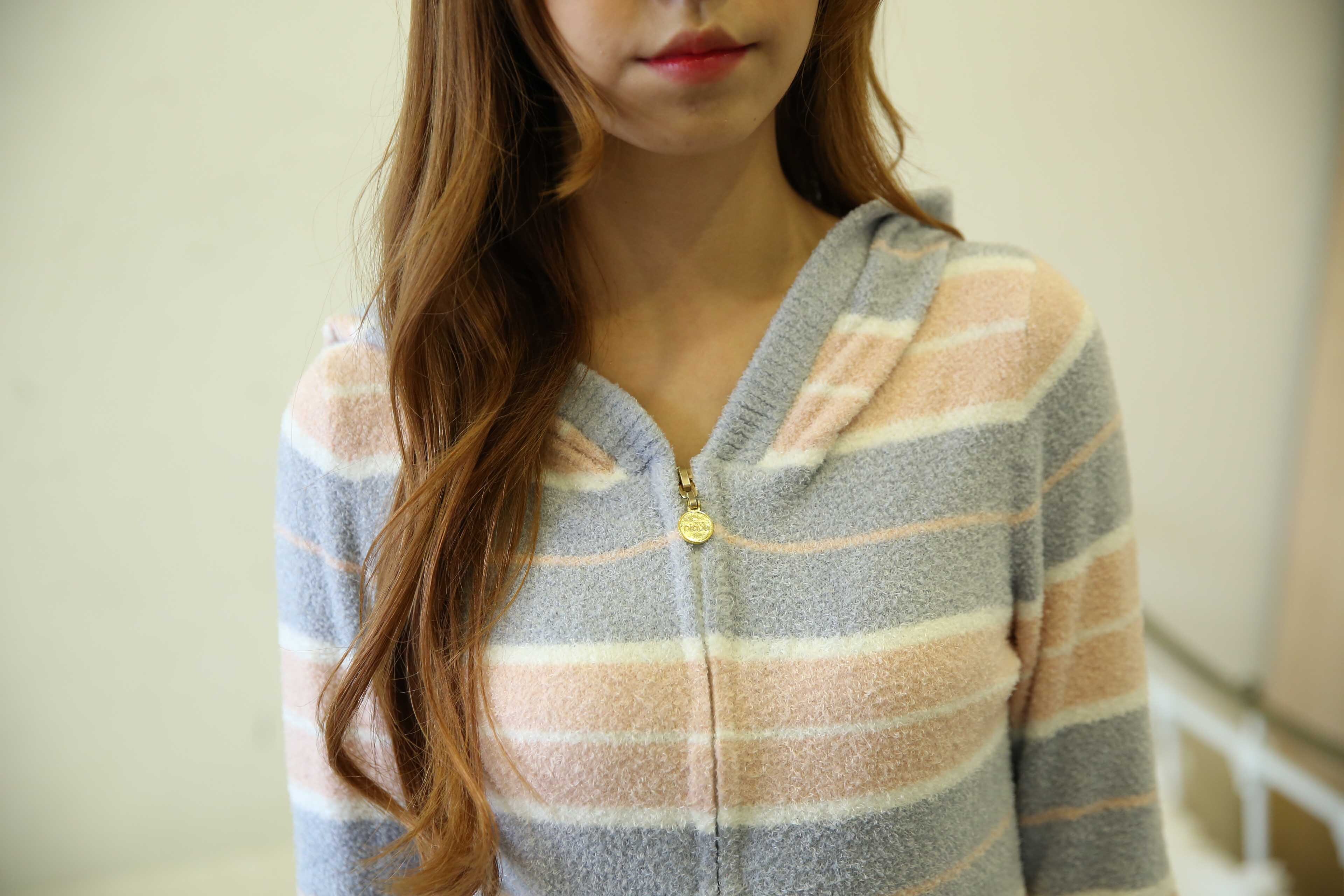 ボーダー柄にフード付きのカジュアルなデザインで、リラックスタイムもオシャレに決まる1着です。
