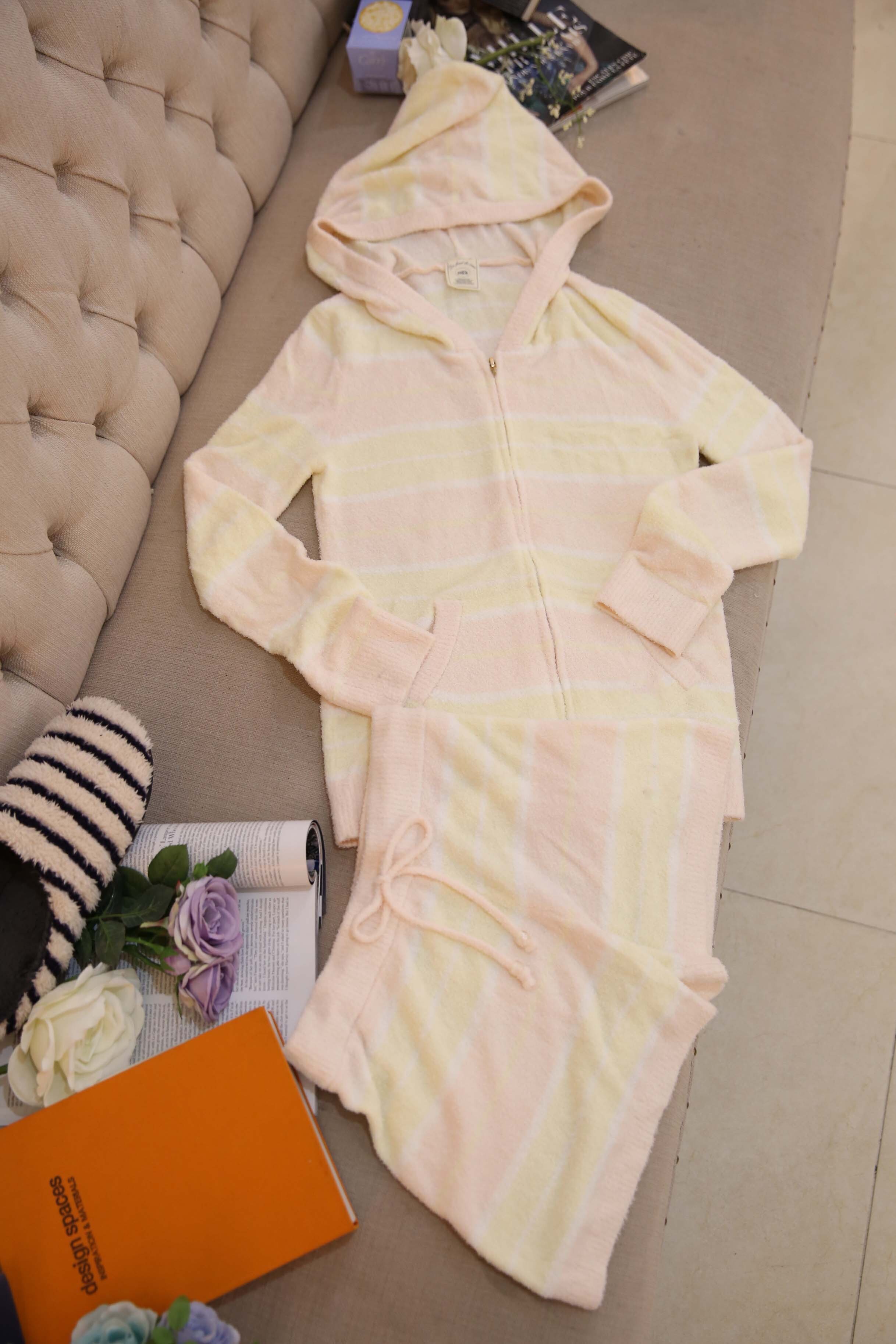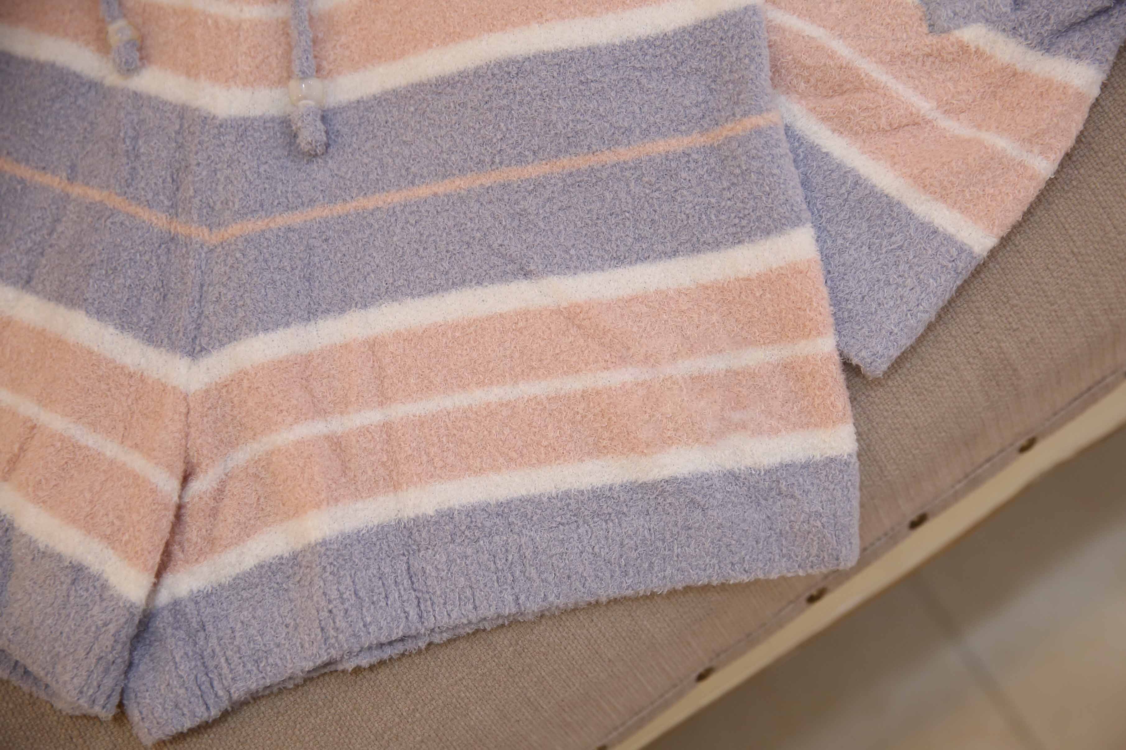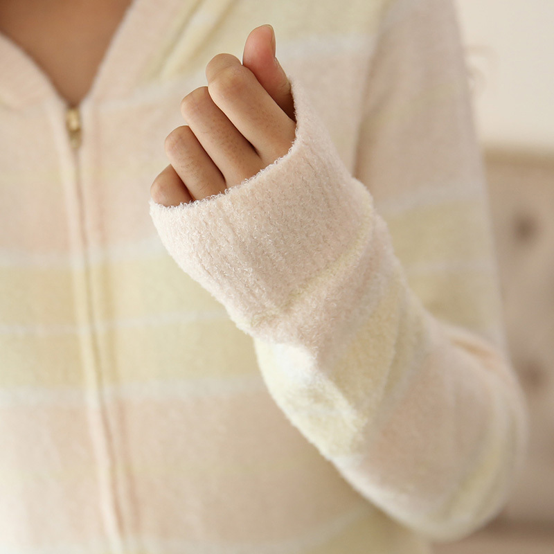 ボーダー柄にフード付きのカジュアルなデザインで、リラックスタイムもオシャレに決まる1着です。
