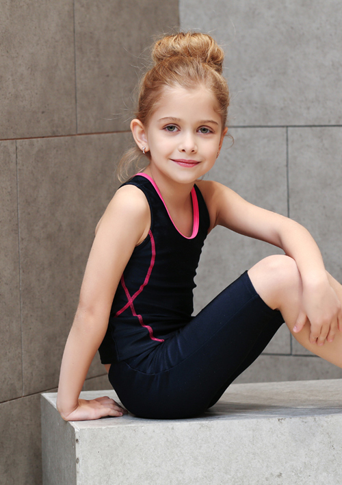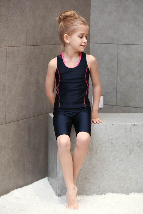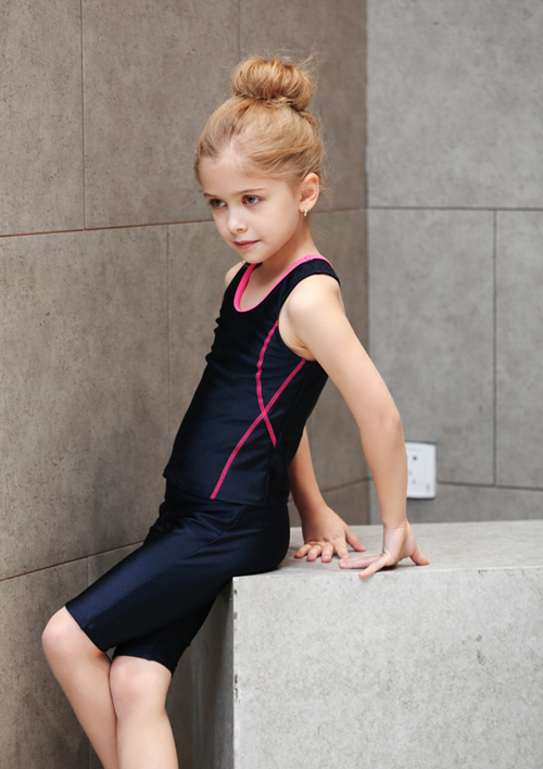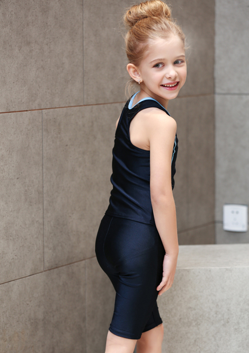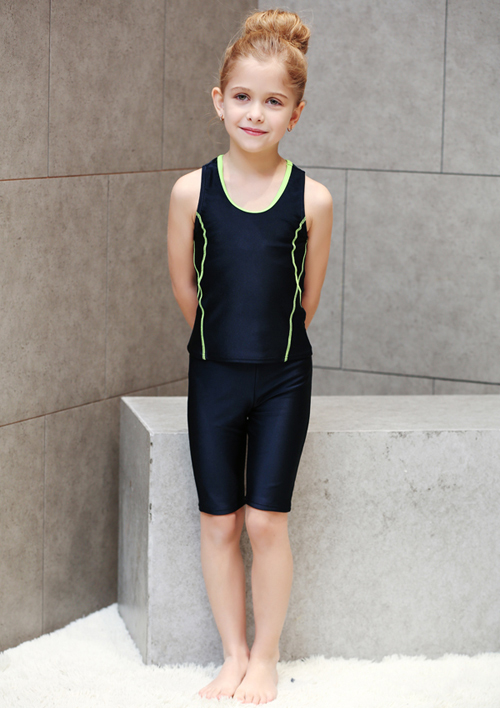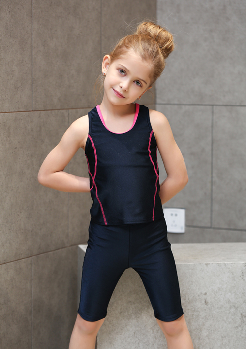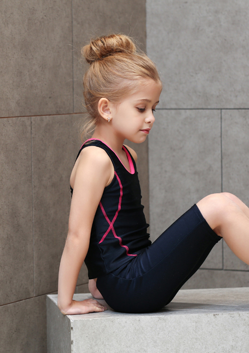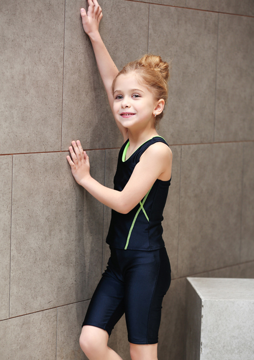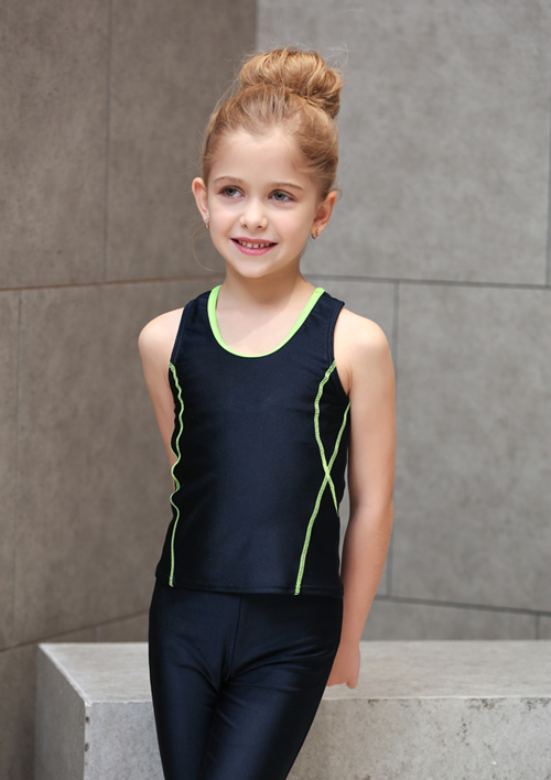 - デザイン:濃紺色をベースに、緑・ピンク・ライトブルーなどの明るいラインがアクセントとなった、タンクトップ型のトップスとパンツ(または七分丈パンツ)のセット仕様です。