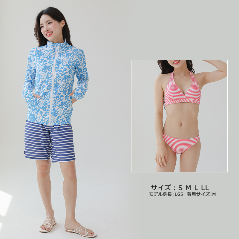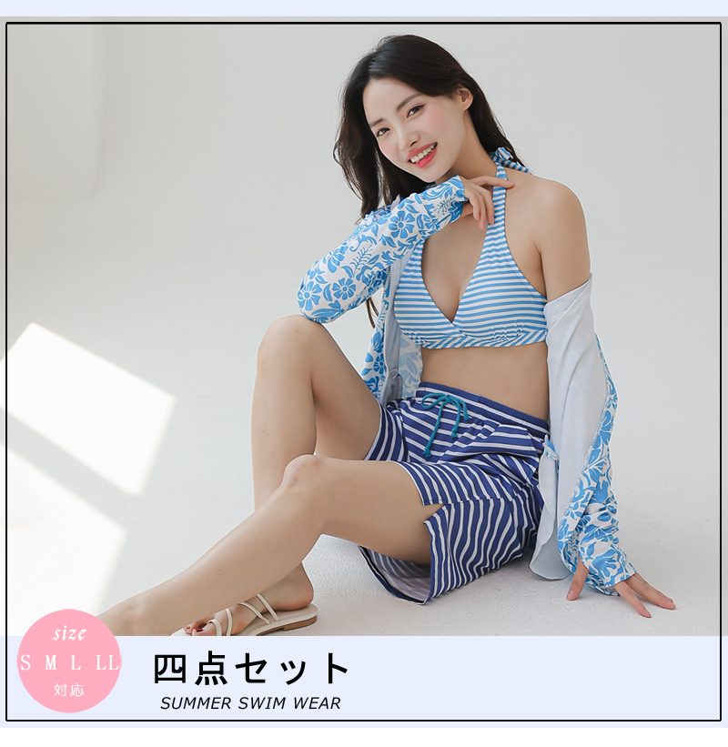 UPF50+UVカットラッシュガードサーフーパンツビキニ4点セット 材質:ポリエステル ポリウレタン 日本語洗濯ネーム表示と日本向の品質、色堅牢度が4級以上 Sサイズ(バスト約79〜83cm ヒップ82〜90cm ウエスト58〜64cm) Mサイズ(バスト約83〜85cm ヒップ87〜95cm ウエスト64〜70cm) Lサイズ(バスト約85〜88cm ヒップ92〜100cm ウエスト70〜78cm) LLサイズ(バスト約88〜95cm ヒップ100〜108cm ウエスト78〜85cm) この商品を全部買って頂いた場合ですが、メールでご相談ください