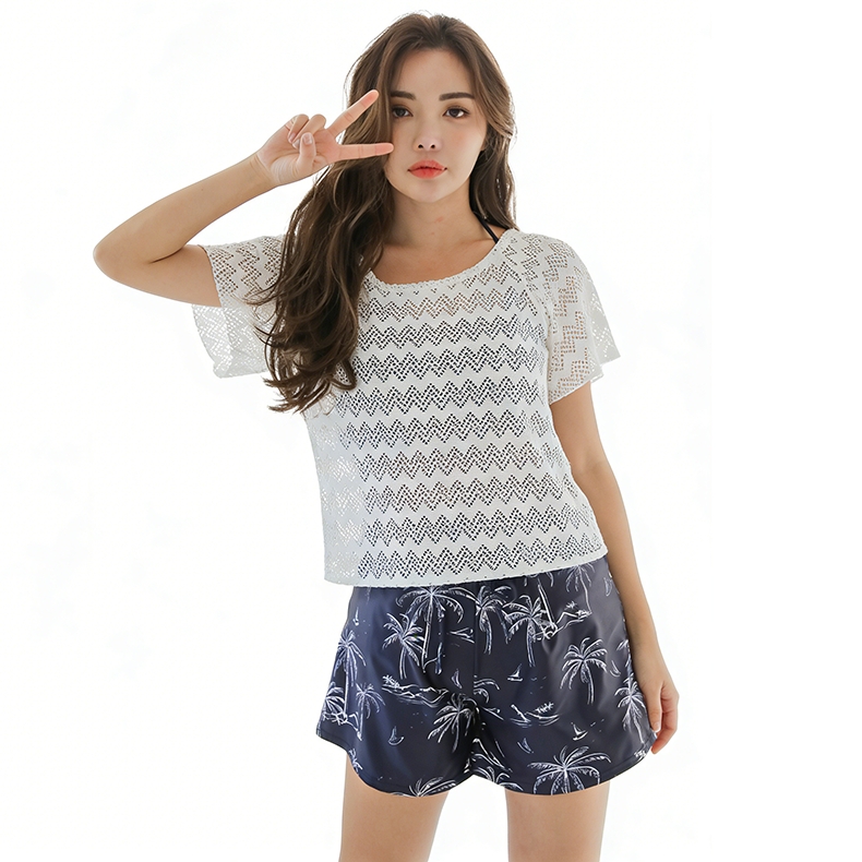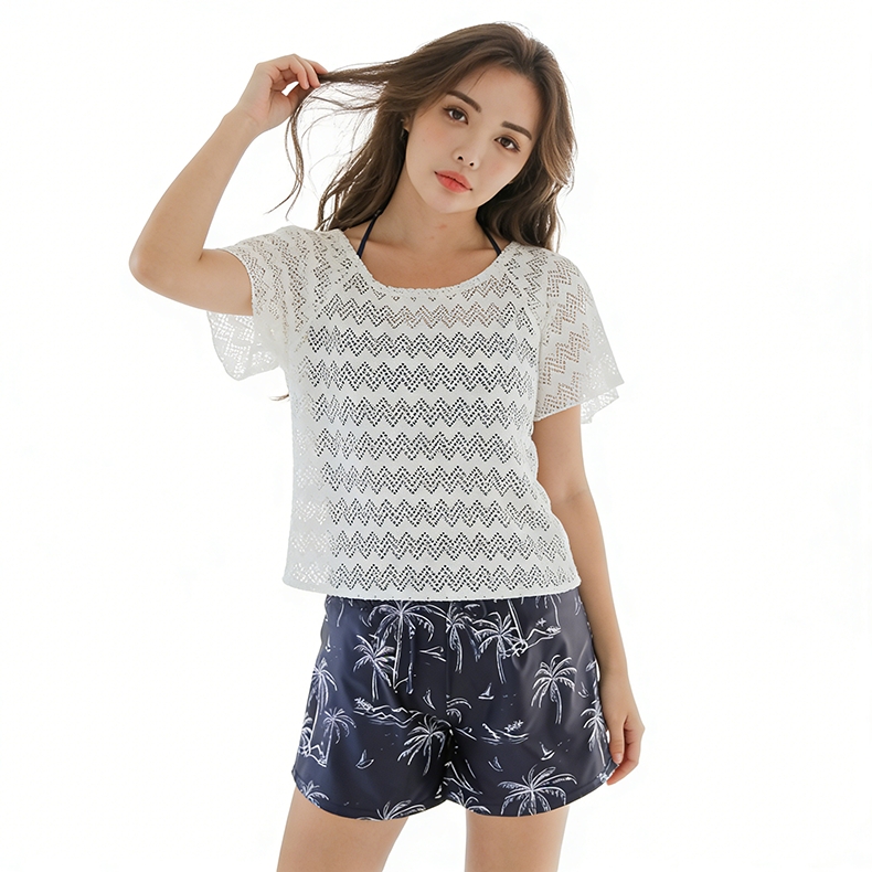 これはカバー力が高く、リゾート感満点のセパレート水着です。清潔感あふれるスタイルで実用性も兼ね備えており、4 点セットの構成と特徴は以下の通りです。